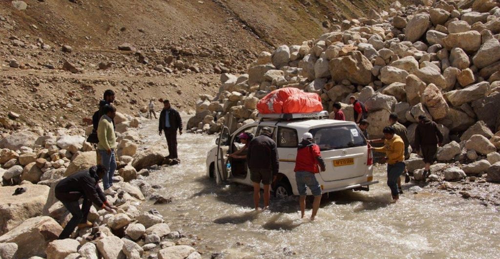 Mit Morgenfrost auf dem Zelt und starken Winden begrüßt uns der neue Tag. Wir machen uns auf den Weg hinab ins Chandra-Tal. Das Wetter ist herrlich. Neben der Straße liegen haushohe granitische Gletschergerölle aus den umliegenden Bergen. Die Blöcke auf der Straße sind nicht weniger klein und erschweren unser Vorankommen erheblich.
