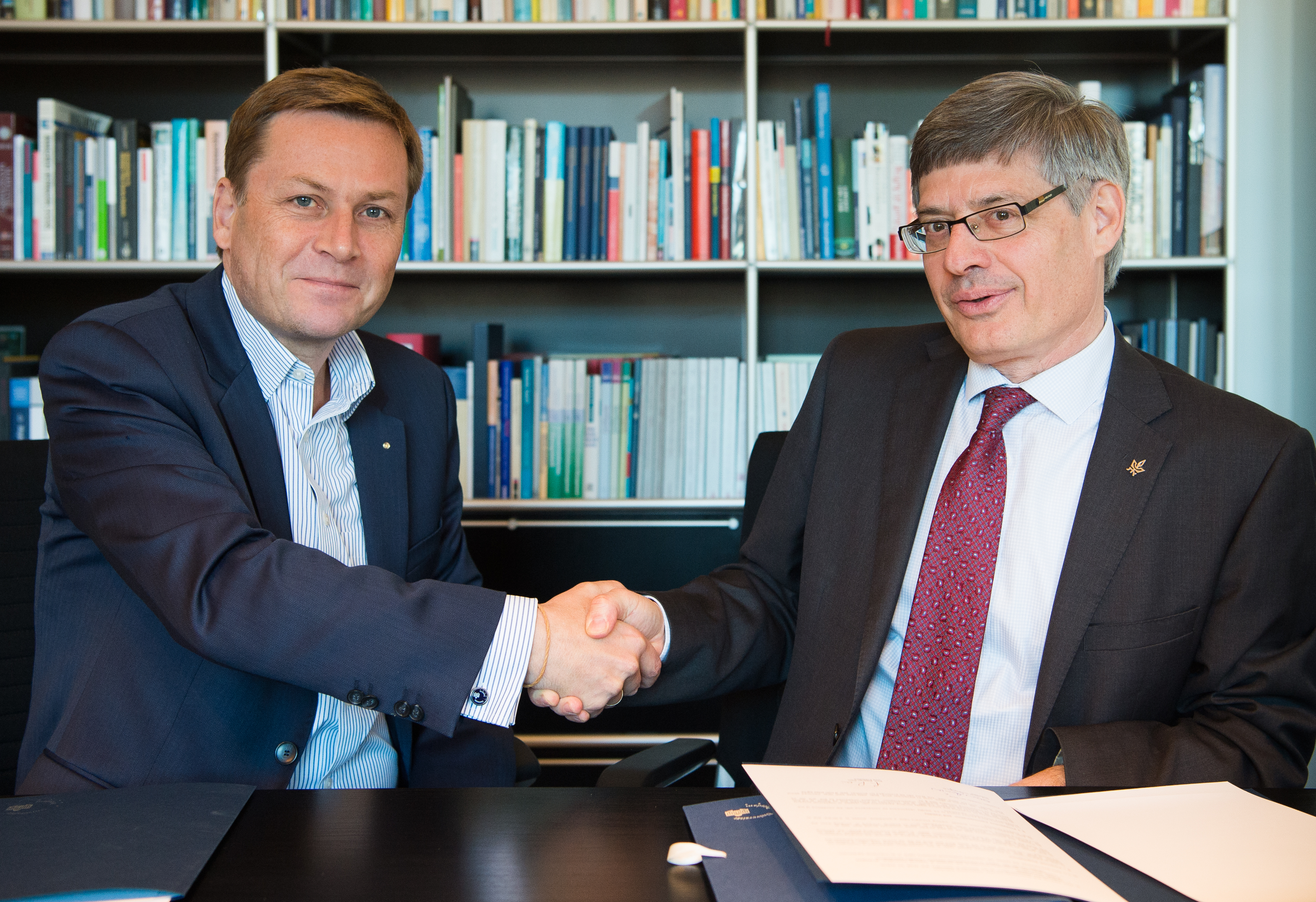 Foto: Universitätspräsident Oliver Günther, Ph.D. (l) und Prof. Raanan Rein, Vizepräsident der Tel Aviv University, unterzeichnen das „Memorandum of Understanding“ (Foto: Karla Fritze)