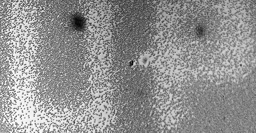 Foto: Initialen der Universität Potsdam, geschrieben in der Monolage von Mikropartikeln. Foto: Prof. Dr. Svetlana Santer.