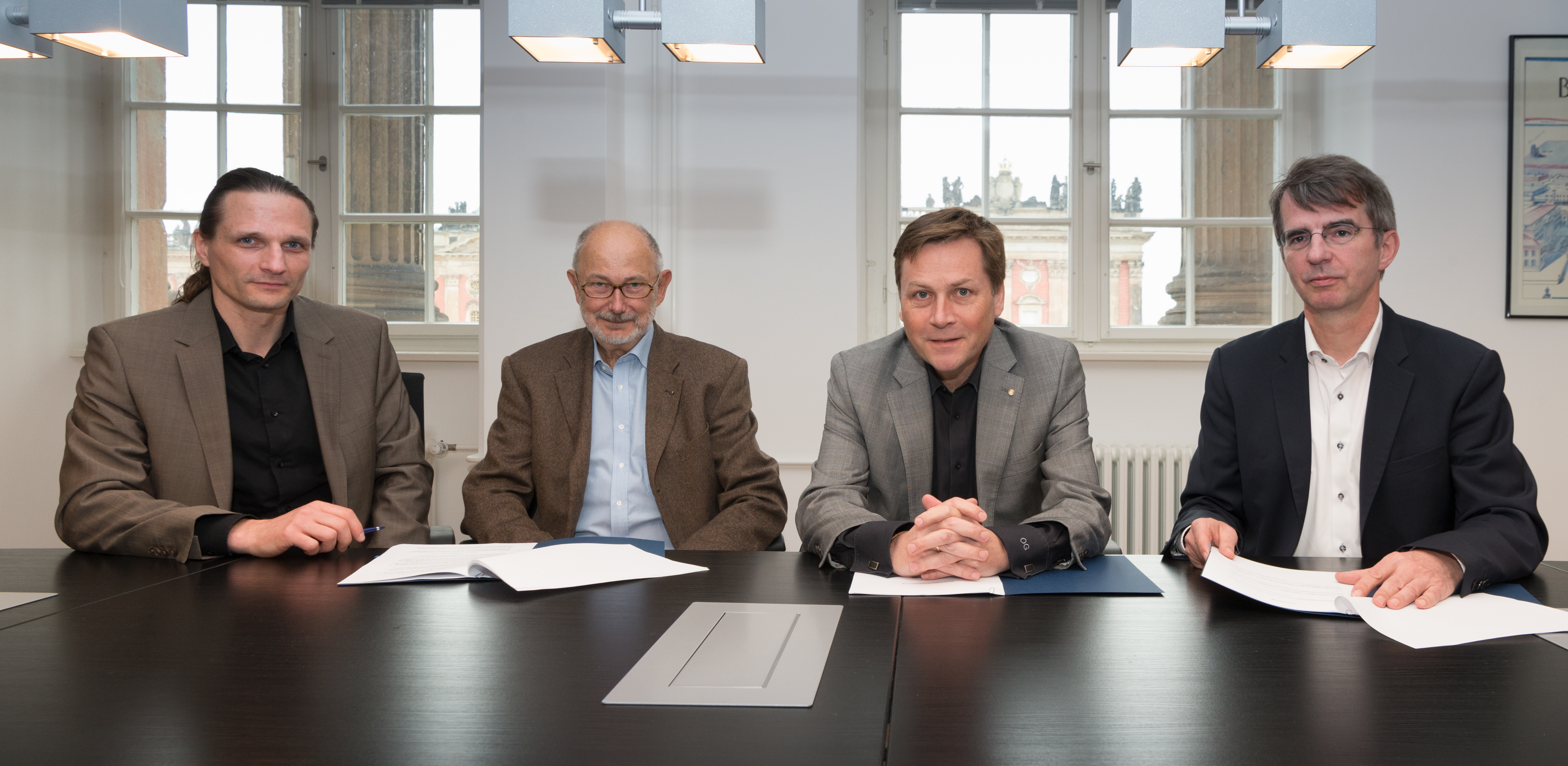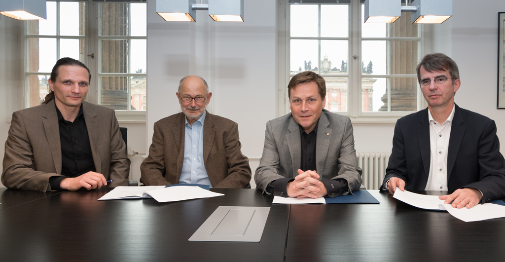 Foto: Dr. Berno Bahro, 1. Vorsitzender des USV, Prof. Dr. Dieter Wagner, 2. Vorsitzender des USV, Prof. Oliver Günther, Ph.D., Präsident der Universität Potsdam, Frank Horn, Geschäftsführer der Hoffbauer gGmbH. Foto: Karla Fritze/Universität Potsdam.