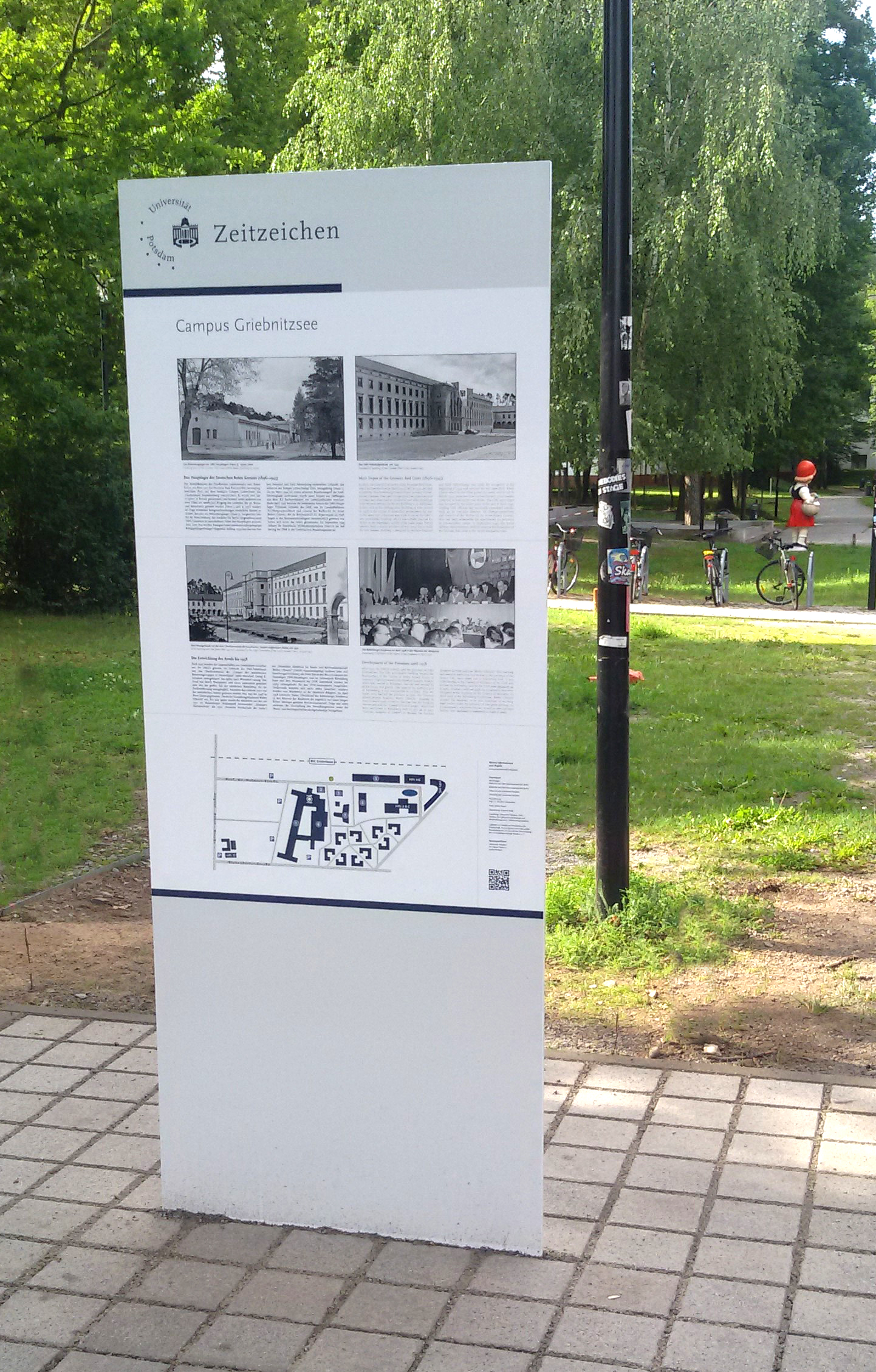 Die drei Standorte der Universität Potsdam – Am Neuen Palais, Golm und Griebnitzsee – blicken jeweils auf eine wechselvolle Vergangenheit zurück. Das Projekt „Zeitzeichen“ holt sie in die Gegenwart zurück und macht sie Interessierten zugänglich: Es dokumentiert die Bau- und Nutzungsgeschichte jedes Campus – direkt vor Ort und zusätzlich im Internet. Mit der Aufstellung der Informationstafeln in Golm und Griebnitzsee sowie der Fertigstellung des ergänzenden Onlineportals ist das im Jubiläumsjahr 2016 begonnene Projekt nun abgeschlossen. Anlässlich ihres 25-jährige Bestehens hatte sich die Universität ihrer eigenen Geschichte, der ihrer Vorgängereinrichtungen und ihrer Standorte gewidmet. So entstand das Portal www.uni-potsdam.de/zeitzeichen, eine umfangreichere Dokumentation der Campusgeschichte mit zahlreichen Fotografien aus allen Zeiten der Nutzung.