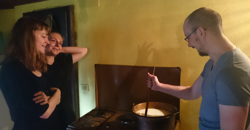 Die Käseherstellung können wir nun selbst einmal ausprobieren. Einen Kessel mit Ziegenmilch sowie einen mit Kuhmilch hatte Nadir bereits am Morgen mit Lab erhitzt und zum Ausflocken bereitgestellt. So können wir gleich mit der Käseherstellung beginnen. Zu Beginn muss die Milch unter kräftigem Rühren mit einem selbsthergestelltem Holzquirl noch einmal auf circa 36° Grad erhitzt werden, was er mit seinem Finger „misst“. Nach Erreichen der Temperatur muss der Kessel noch einmal für zehn Minuten zur Seite gestellt werden, damit sich die Käsemasse in der Milch absetzen kann. Bevor wir die Käsemasse in Form bringen, sammeln wir die Käseflocken mit der Hand zu einem Ball zusammen, der in Plastiksiebe gepresst wird und somit das überschüssige Wasser verliert. Die Milch von acht Ziegen reicht für drei kleine und die Milch von zwei Kühen für einen großen Käse. Diese salzt er morgen früh und wird sie dann in den nächsten 14 Tagen zweimal täglich wenden und bürsten.