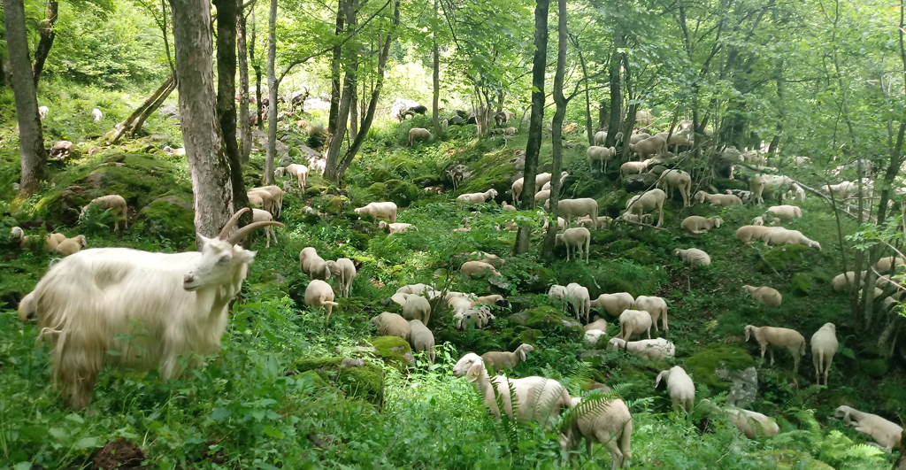 Gestern Abend erfahren wir, dass zwei Hirten mit ihrer Schaf- und Ziegenherde, circa 200 Tiere, aus dem Winterquartier in der Ebene nach San Antonio gekommen sind. Sie waren etwa zehn Tage über Landstraßen hinaufgezogen. Wir laufen zunächst nach Pianello und begegnen auf dem Weg bereits den Ziegen von Nadir. Er hat sich erst im Alter von 30 Jahren dem Hirtentum verschrieben. Seitdem bewohnt er eines der noch nicht verfallenen Häuser von Pianello. Der Wohnraum liegt direkt über dem Ziegenstall. Seine Hündin, Nuvola, begrüßt uns freudig und jagt die vier neu erworbenen, aus Frankreich stammenden Ziegen umher, da sie diese noch nicht als Teil der Herde akzeptiert.