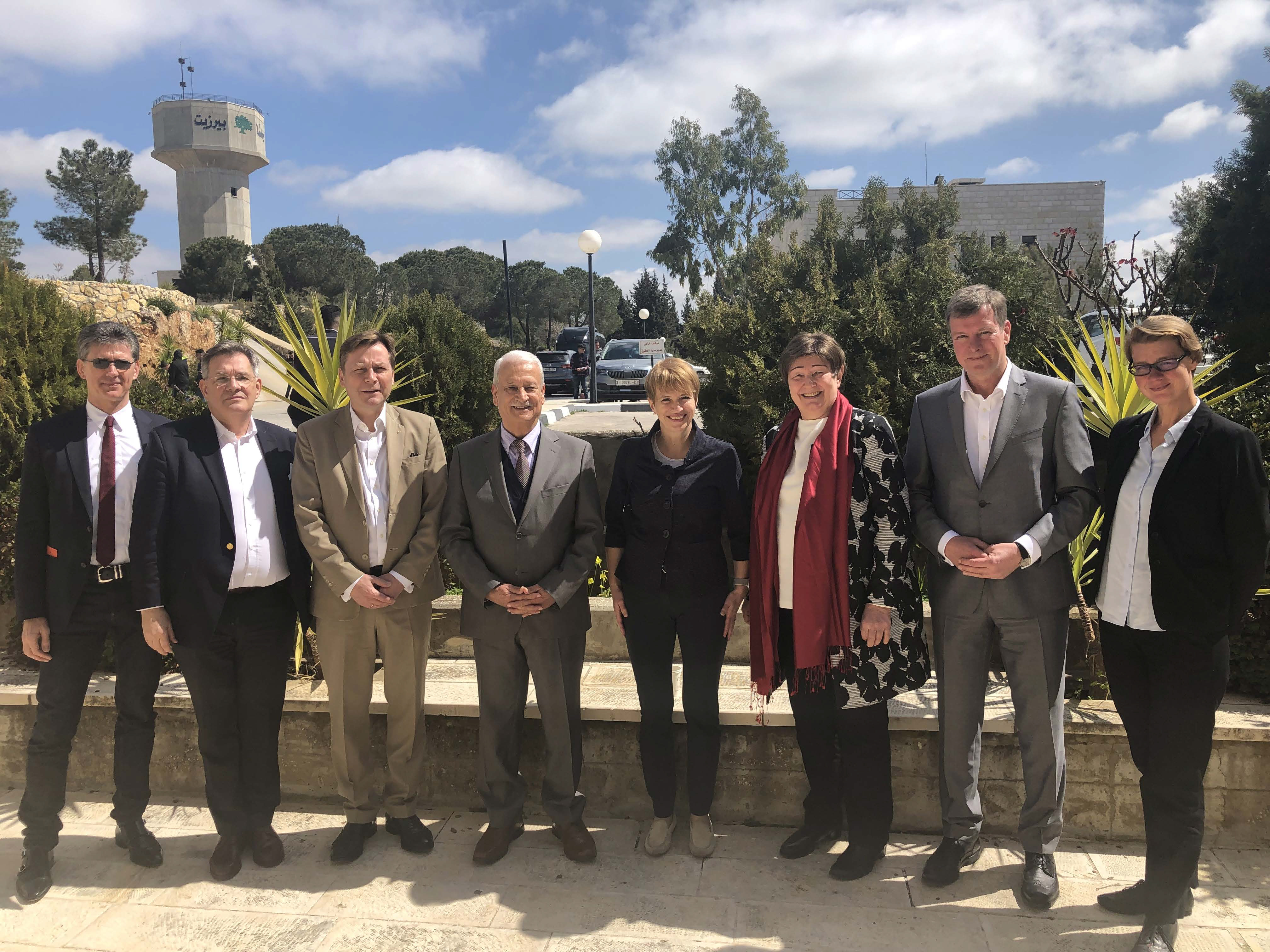 Foto: V.l.n.r.: Prof. Dr. med. Heinz Völler; Vizepräsident Prof. Dr. Florian J. Schweigert; Uni-Präsident Prof. Oliver Günther; Dr. Abdullatif Abuhijleh, Präsident der Birzeit Universität; Wissenschaftsministerin Dr. Martina Münch; Dr. Dorothea Rüland, Generalsekretärin des DAAD; Carsten Feller; Leitung der Abteilung Wissenschaft und Forschung im MWFK; Dr. Nicole Münnich, Referatsleiterin im MWFK (Foto: Dr. Vera Ziegeldorf)
