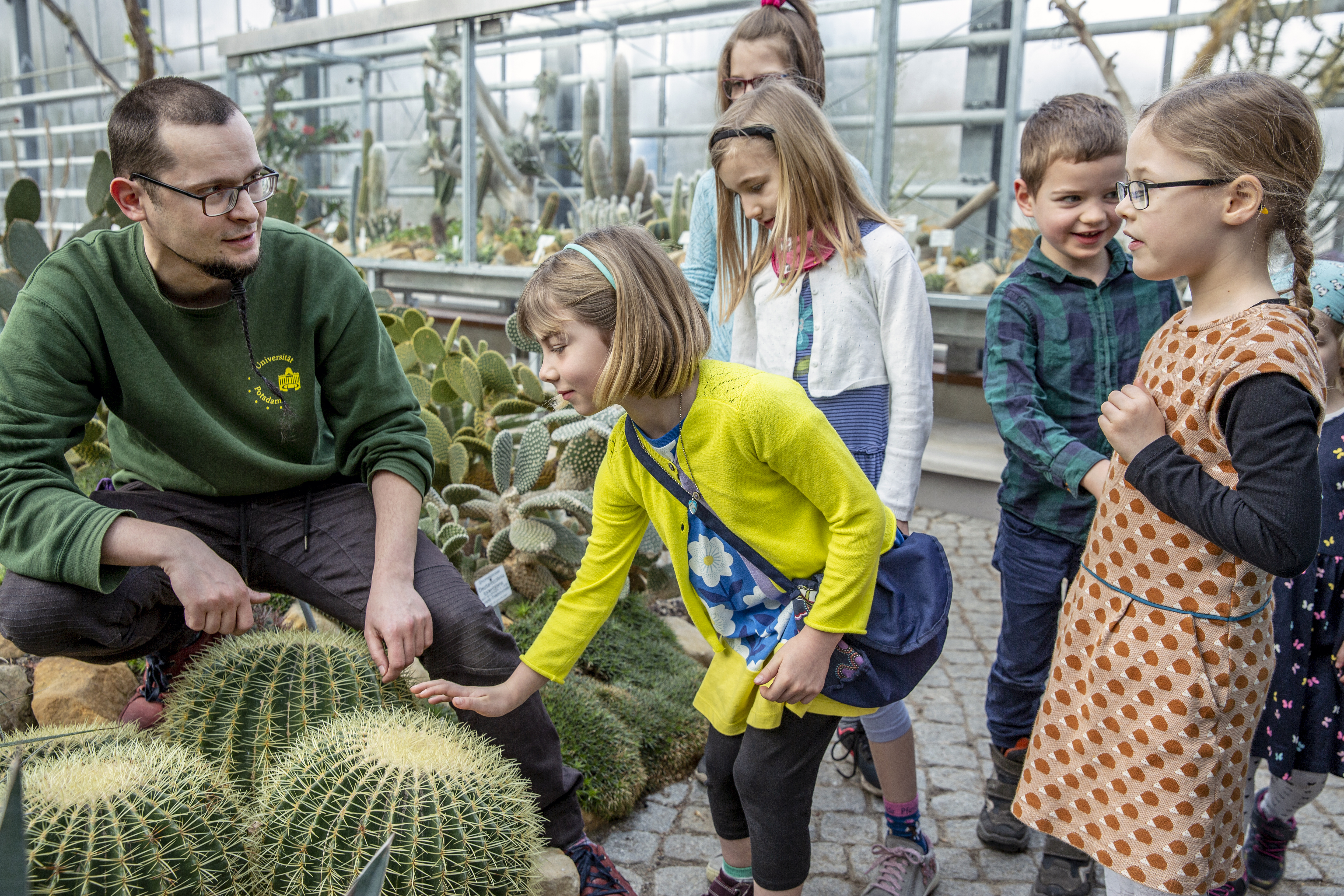 Foto: Gartenpädagoge Steffen Ramm mit einer Gruppe von Kindern im Kakteenhaus des Botanischen Gartens  (Kerstin Fende)