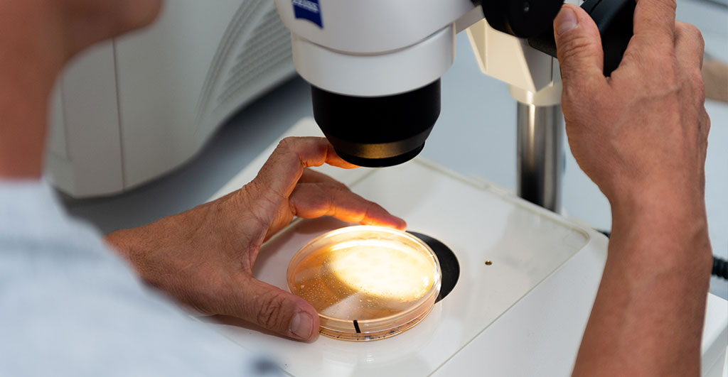Im fortgeschrittenen Entwicklungszustand differenzieren sich die Dicty- Zellen, indem sie einen Stiel und Fruchtkörper mit Sporen ausbilden. Mit der Differenzierung hört die Zellteilung dann auf. „Die Fruchtkörper, die wir hier im Labor sehen, haben etwa eine Höhe von einem Millimeter mit einem Durchmesser des Sporenbehälters von 0,2 Millimeter“, erklärt Gräf mit Blick durch das Okular. Die Fenster vor ihm sind großteilig mit Silberfolie abgedunkelt. Weniger zum Schutz vor der hochsommerlichen Außentemperatur, sondern in erster Linie wegen des störenden Tageslichts – Fluoreszenzmikroskopie braucht Dunkelheit. Dafür nutzen die Zellbiologen auch einige fensterlose Räume, in denen die notwendigen Geräte stehen. Wie das „Spinning Disk Konfokalmikroskop“ – Hightech und hochpreisig, wie der Name schon vermuten lässt.