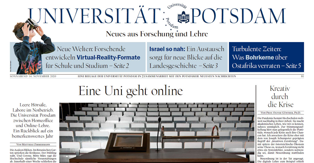Leere Hörsäle, Labore im Notbetrieb. Eine Universität zwischen Homeoffice und Online-Lehre. In der am vergangenen Samstag erschienenen Beilage im Tagesspiegel und in den Potsdamer Neuesten Nachrichten schaut die Universität Potsdam zurück auf ein denkwürdiges Jahr. Zu lesen ist von virtuellen Exkursionen, sichtbaren Tönen und einer Idee von Unendlichkeit. Studierende kommunizieren mit Kommilitonen in Israel via Internet und kommen doch einander ganz nah. In Ostafrika legt ein Bohrkern offen, wie sich frühzeitliche Menschen an plötzliche Umweltveränderungen angepasst haben. Ob das den unter Dürre leidenden Pflanzen im Park Sanssouci auch gelingt, steht in den Sternen. Immerhin dient die kosmische Strahlung dazu, im Gelände die Feuchte des Bodens zu messen.