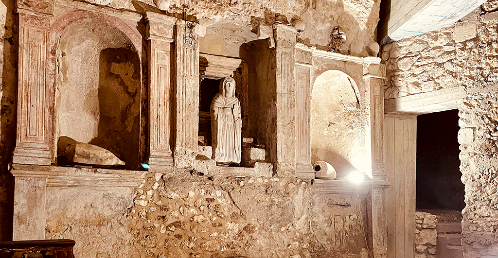 Unsere Exkursion führt uns weiter durch die Gassen von Cagliari zur „Cripta di Santa Restituta“. Wir steigen die steilen Felsentreppen unter der gleichnamigen Kirche hinab in die Krypta. Von dem unterirdisch gewölbten Grabbau gehen einige Gänge ab, die in weiteren kleinen Räumen enden und mit künstlichem Licht ausgeleuchtet sind. Das Hypogäum wurde teilweise in den Felsen geschlagen, besteht aber auch aus natürlich entstandenen Höhlen. Besonders interessiert uns hier das immer noch erhaltene Bildnis Johannes des Täufers aus dem 13. Jahrhundert n. Chr. an der Wand. Ebenso wie die zuvor besichtigte Grabstätte wurde auch diese Krypta als Luftschutzraum bei Bombenangriffen genutzt.