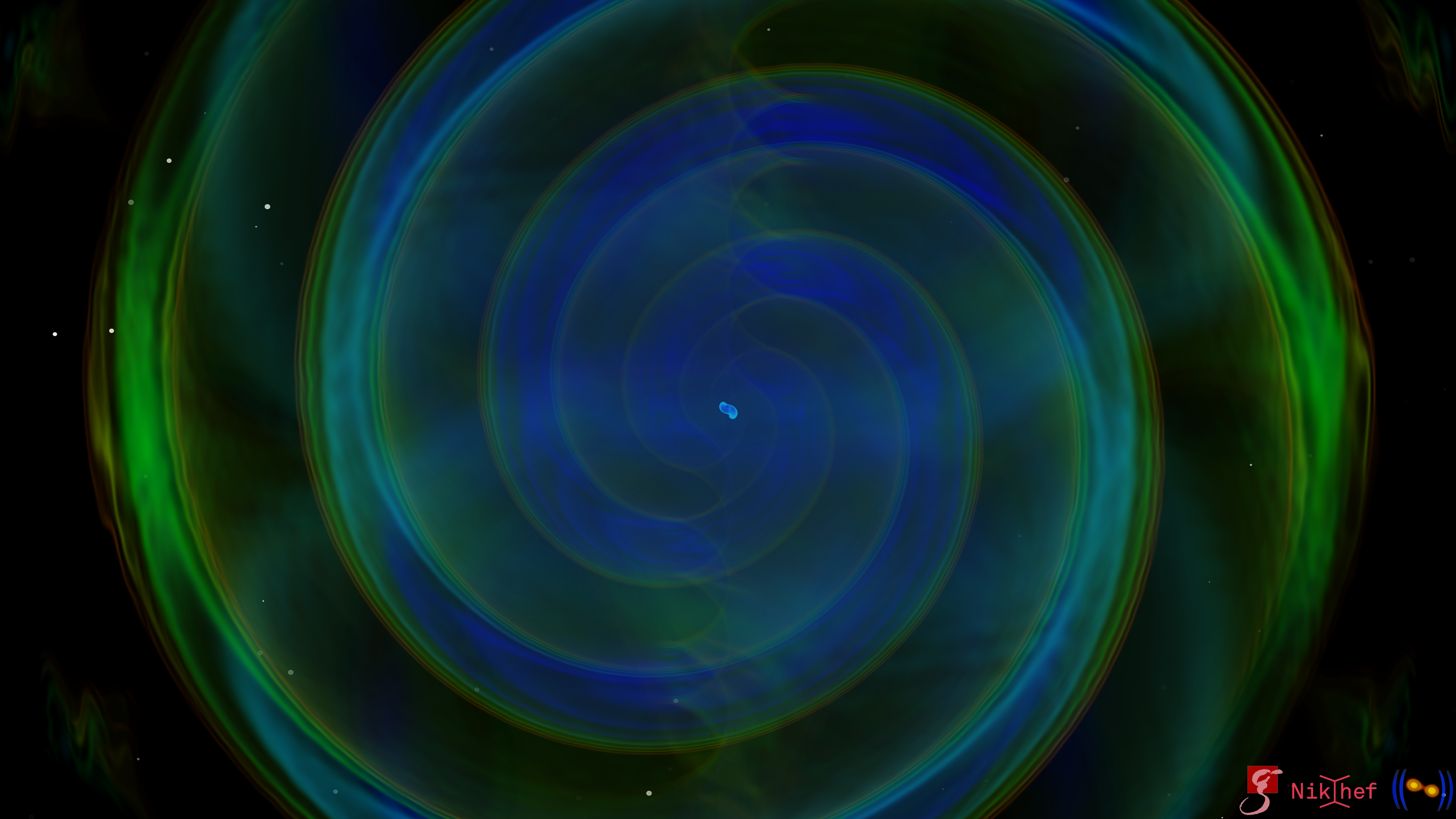 Abbildung: Numerisch-relativistische Simulation der Verschmelzung zweier Neutronensterne, die zu dem am 25. April 2019 gemessenen Gravitationswellenereignis (GW190425) führte. Bildrechte: T. Dietrich, S. Ossokine, A. Buonanno, W. Tichy and the CoRe-collaboration.