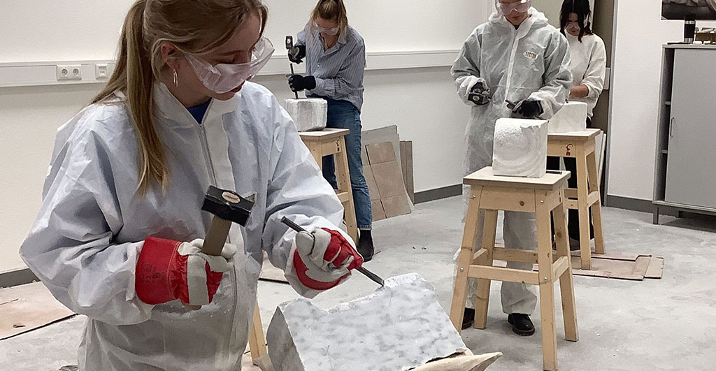 Die Studierenden in der Bildhauerei zeigen in der Ausstellung Arbeiten am Stein mit all ihren Verwerfungen, Unsicherheiten, Erkenntnissen und Glücksmomenten. „Das Schlagen am Stein als subtraktives Verfahren fordert Prozesse des Sehens, des Hörens, des Fühlens und auch die des Perspektivwechsels heraus. Immer wieder einen Schritt zurückzutreten, erneut den Blick auf die Arbeit zu richten, erlaubt eine genauere Reflexion, erweitert das Vermögen von Vorstellung und ist Teil des Gesamtprozesses der bildhauerischen Arbeit am Stein“, so die Dozentin Ivette Widmann.