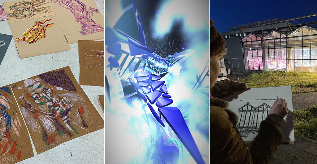 Neu in der Kunstausbildung an der Universität war im zurückliegenden Jahr auch eine Werkstatt zu Urban Art. Die Studierenden bekamen hier Einblicke in die Kultur des Graffiti Writings, erlernten Techniken der Aerosol Art und erprobten verschiedene Strategien der urbanen Kunst. Gemeinsam mit ihrem Dozenten Mark Straeck entwickelten sie kraftvolle Ausdrucksformen. Ergebnisse ihrer Arbeit werden in der Waschhaus-Arena ausgestellt, ebenso wie ein fragiles, veränderbares Papierhaus. Studierende erkundeten mit Stift und Papier die unterschiedlichen Zeitschichten ihres geschichtsträchtigen Unicampus in Golm. Die vor Ort gezeichneten Raumansichten wurden in Bezug zu aktuellen Portraits der Studierenden gesetzt. Ihre Dozentin Lilla von Puttkammer bezeichnet diese Herangehensweise als „Archäologie der Zukunft“.