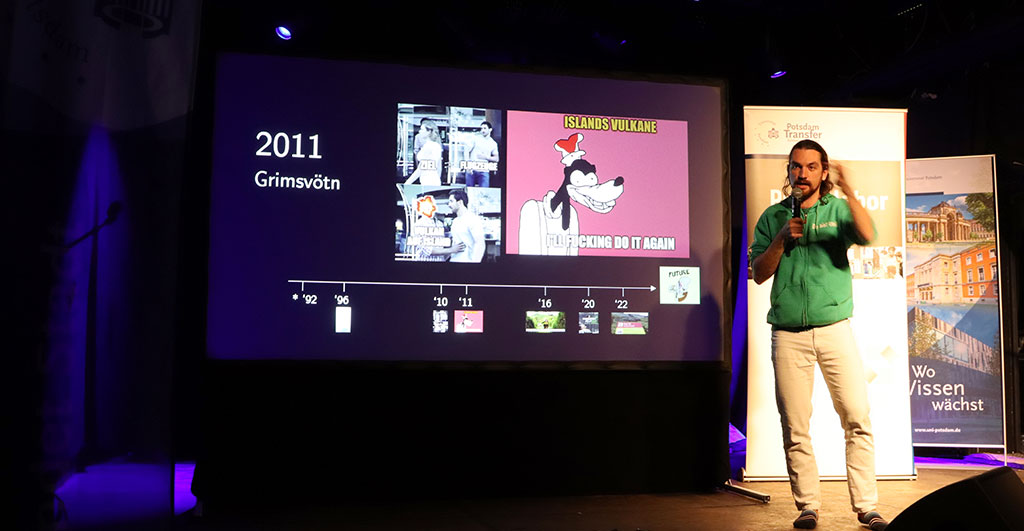 Im November verwandelte sich dann auch das Potsdamer Waschhaus im Kunst- und Kulturquartier Schiffbauergasse zu einem Ort gelebter Wissenschaft. Potsdam Transfer und die Öffentlichkeitsarbeit der Universität boten im Herzen der Stadt einen Science Slam vor ausverkauftem Haus. Einen Abend lang gab es Gelegenheit, über den Tellerrand des eigenen Wissens zu blicken: Sechs Slammerinnen und Slammer unterhielten die Publikums-Jury mit der „Physik der Orgelpfeifen“, ließen Vulkane brummen, ergründeten „Crypto Magic“ oder surften mit philosophischer Geradlinigkeit durch Youtube. Mit dem Biologie-Doktoranden Bryan Nowak führte ein versierter und selbst prämierter Science Slammer mit Witz und Leidenschaft durch den Abend, den letztlich die Bioinformatikerin Neeltje Schilling mit ihrem Slam über den programmierten Zelltod von Pflanzen für sich entschied. Ein mehr als gelungener Abschluss des Science-Slam-Jahres 2022 und zugleich vielversprechender Auftakt für alles, was da noch kommt.