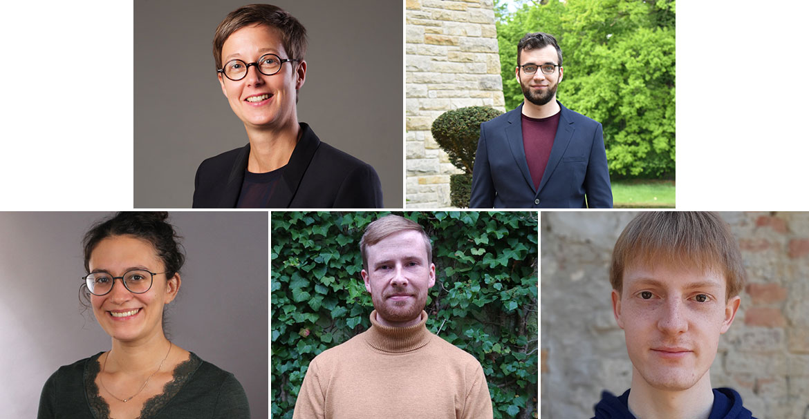 Abbildungen: Preisträgerinnen und Preisträger 2023. Oben: Prof. Karoline Wiesner, Dr. Timon Thomas. Unten: Prof. Alexandra Carpentier, Henrik Rose, Remo Ziemke. Bildrechte: Anna Neuweiler/Lisa Seiler/privat.