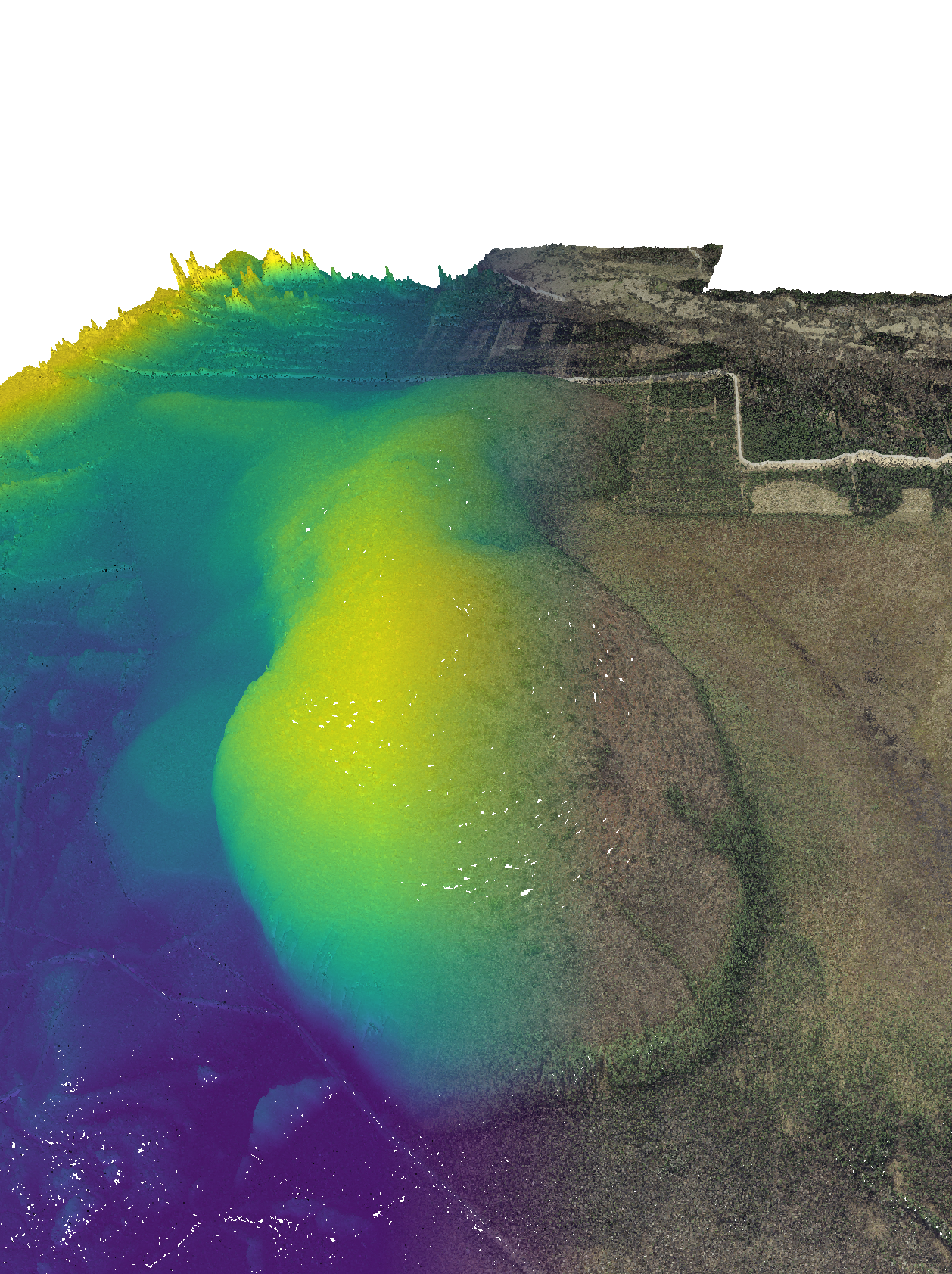 Abbildung: 3D-Perspektive aus luftgestützten Lidar-Punktwolken für die Moorregion Valgeraba in Estland. Die Farben zeigen die Höhenkodierung (linke Seite) und die tatsächlichen Oberflächenfarben der Luftaufnahmen (rechte Seite). Die Aufnahme wurde 50-fach überhöht um die Form des Moores zu zeigen. Der Höhenunterschied des Moores zur Umgebung beträgt nur wenige Meter und kann nur mit hochauflösenden Topografiedaten erfasst werden. Bildrechte: Bodo Bookhagen.