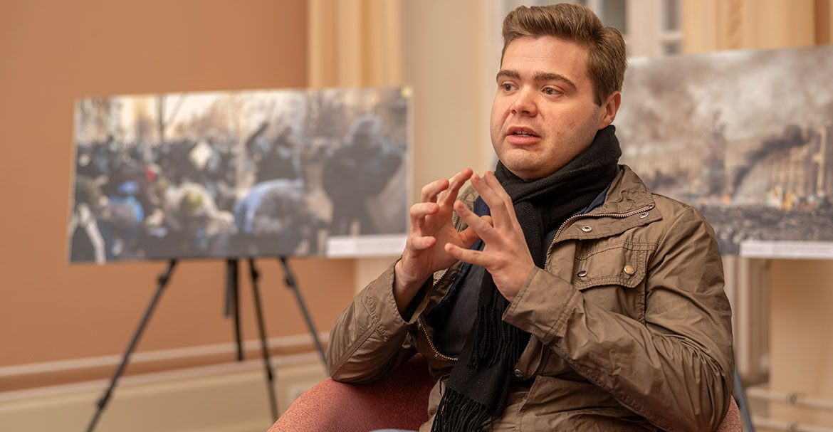 „Die Revolution der Würde ist jetzt genau zehn Jahre her“, sagt Poliluev-Schmidt, der seit 2019 in Deutschland wohnt und in Potsdam Biochemie und Molekularbiologie studiert. „In Deutschland und auch anderswo wurde sie übersehen. Und als berichtet wurde, sprach man zunächst entweder von einem Putsch oder einem Aufruhr von Rechtsradikalen.“ Erst später seien die Ereignisse als Revolution bezeichnet worden. Danylo Poliluev-Schmidt stammt aus der Ukraine und hat auch polnische Wurzeln. Während der Revolution der Würde 2013/14 studierte er in Lwiw. „Als ich hörte, dass der Präsident Wiktor Janukowytsch das Abkommen zum Beitritt der Ukraine nicht unterschreiben wird, hatte ich das Gefühl, jemand habe meine Zukunft gestohlen. Ich bin 1996 in der unabhängigen Ukraine geboren und wuchs mit der Idee auf, dass wir ein Teil der EU und der NATO werden – so wie Polen, Litauen, Lettland und Estland.“ Der Student reiste nach Kiew und ging dort mit Tausenden Menschen auf die Straße. „Als die militärische Polizeiabteilung mit Gewalt gegen die friedlichen Demonstranten vorging, haben wir verstanden, dass uns diese Regierung nur unterdrücken wird.“ Die Mehrheit der Protestierenden waren Studierende. „An manchen Tagen waren unzählige Menschen auch bei minus 20 Grad auf dem Majdan. Wir standen so dicht, dass wir nicht froren, und sangen die Nationalhymne: ‚Wir werden unseren Körper und unsere Seele für unsere Freiheit geben.‘“ Viele Menschen wurden damals verletzt, bei einer Demonstration am 20.2.2014 wurden über 100 Menschen erschossen. Bis heute ist unklar, wer für ihren Tod verantwortlich ist. „Es ging damals um mehr als den EU-Beitritt, nämlich um die Demokratie und unsere Meinungsfreiheit. Diese Ereignisse haben der Ukraine geholfen, weiterzukämpfen und ihre Würde, ihre Demokratie zu verteidigen, nicht nur auf dem Papier“, sagt Danylo Poliluev-Schmidt.
