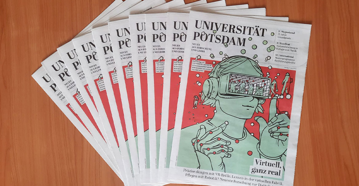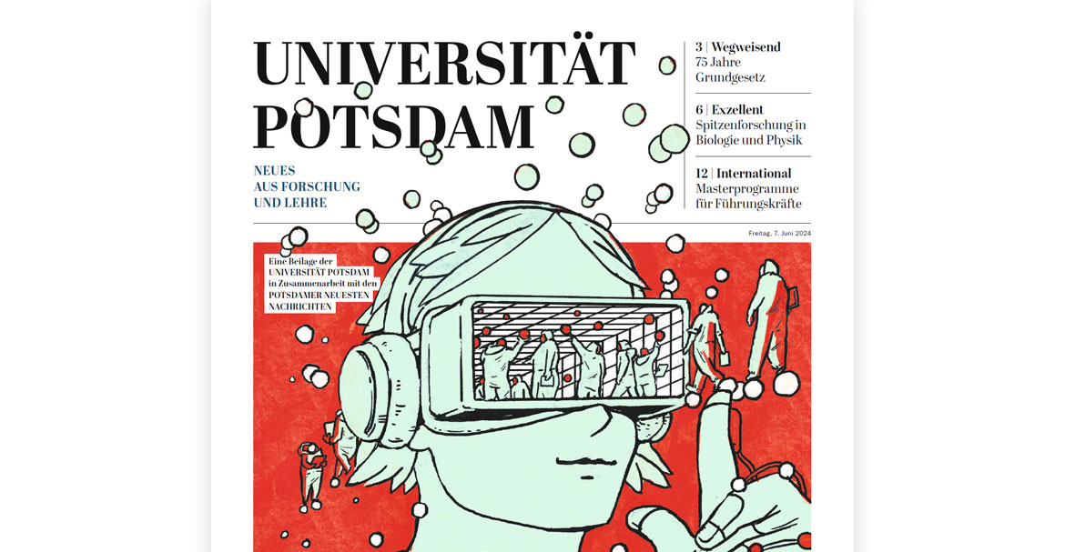 Virtual Reality in der Landwirtschaft? Mit künstlicher Photosynthese CO₂ reduzieren? Polymere als Antibiotika? Über Neuestes aus Forschung und Lehre berichtet die Universität Potsdam in ihrer aktuellen Beilage im Tagesspiegel und in den Potsdamer Neuesten Nachrichten. Uni-Präsident Oliver Günther schreibt über Zivilcourage, Toleranz gegenüber anderen Meinungen und die Fähigkeit zur Differenzierung auf dem Campus. Im Interview erklärt Historiker Frank Bösch, warum die im Grundgesetz festgeschriebenen Rechte oft erst erkämpft werden mussten. Wie sich Menschen weltweit gemeinsam den globalen Herausforderungen stellen und die Lasten des Klimawandels gerecht verteilt werden können, ist ebenso zu lesen wie das Porträt einer Studentin, die für den Klimaschutz schon mal in eiskaltes Wasser steigt. Nicht zuletzt wird berichtet, dass im Herbst die Ausbildung von Lehrkräften für berufliche Schulen startet und dass das beharrlich verfolgte Projekt einer Potsdamer Universitätsschule nun in greifbare Nähe rückt.