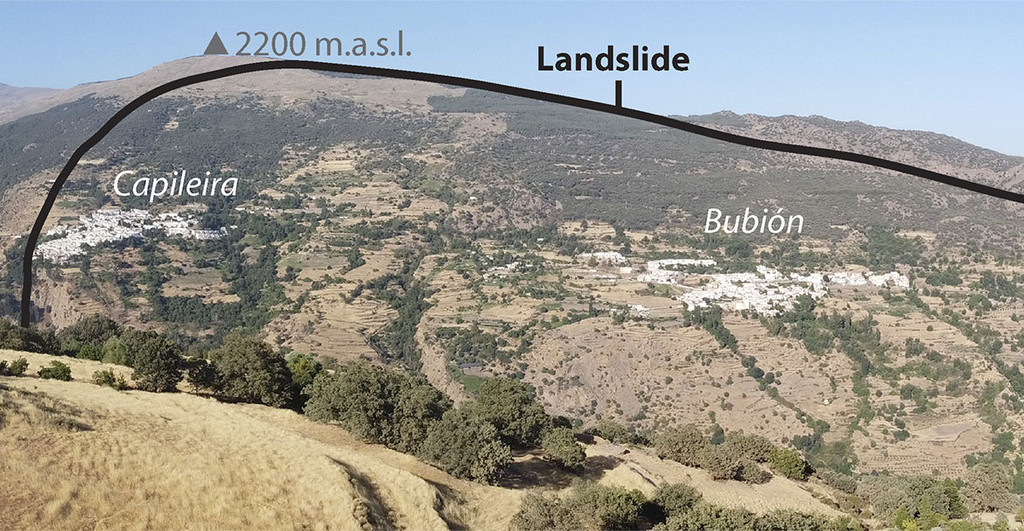 Abbildung: Siedlungen auf einem sich langsam bewegenden Erdrutsch im Poqueira-Tal, Spanien. Bildrechte: Cristina Reyes-Carmona