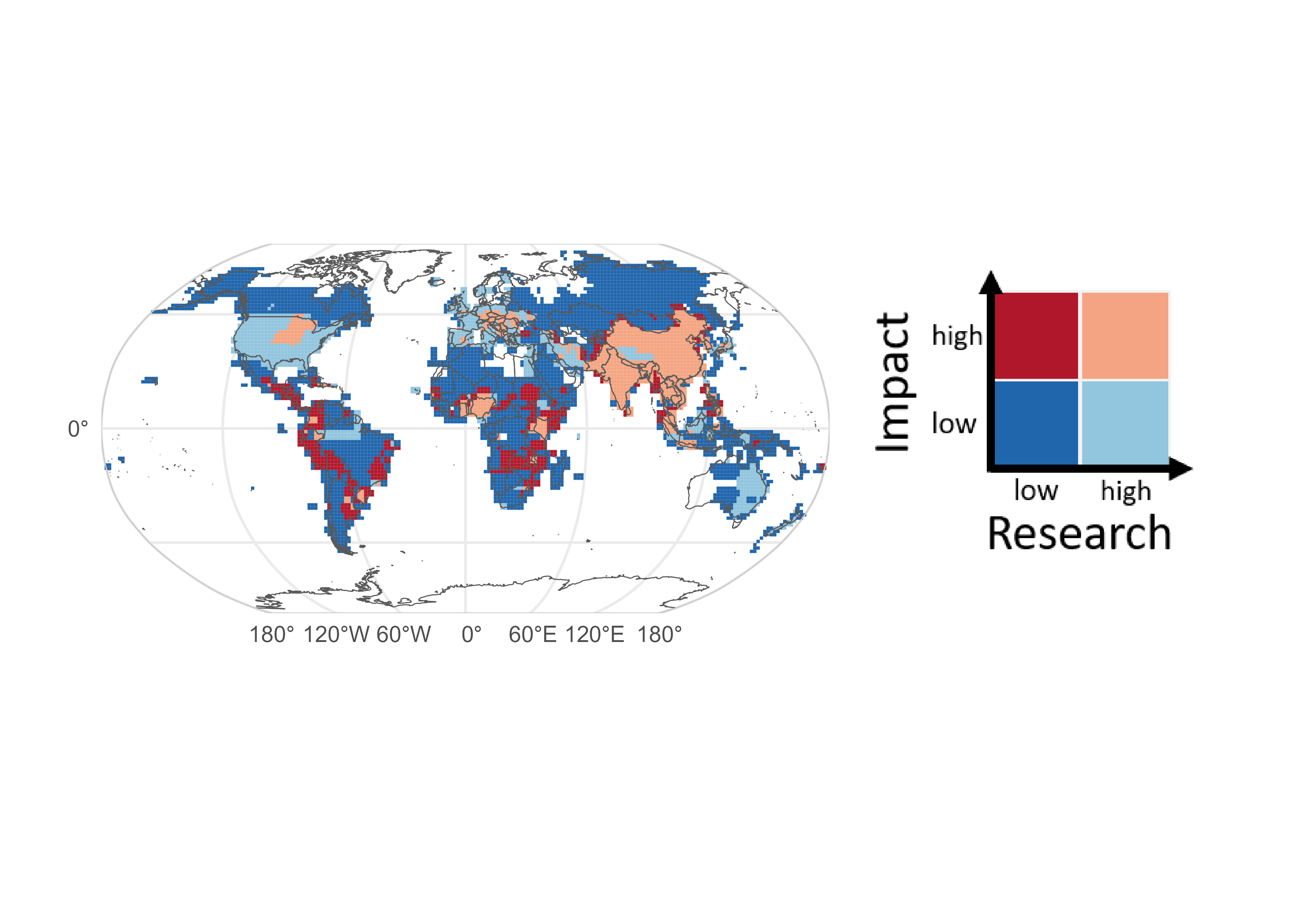 Abbildung 2: Globale Karte der Forschungsaktivitäten (Research) in Relation zum Auftreten (Impact) von Dürren. Bildrechte: Lina Stein.
