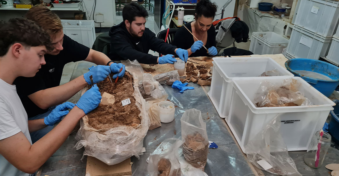 Am dritten Tag starten wir nach dem Frühstück und fahren direkt zum Museu Arquelògic de Borriana, da es den ganzen Tag regnet und wir deshalb nicht weiter an der römischen Villa graben können. Alle finden es schade, dass die Ausgrabungen unterbrochen werden müssen, da wir gerne noch einen weiteren Tag die verschiedenen Bereiche der Villa ausgegraben hätten. Nach einem verregneten Weg zum Museum werden wir in Teams mit den spanischen und italienischen Studierenden aufgeteilt. Einige von uns arbeiten an Amphoren, andere reinigen Knochen, und wieder andere putzen Keramikfragmente. Die spannendste Aufgabe ist die Freilegung von bronzezeitlichen Asche-Urnen, die noch Knochenfragmente enthalten. Parallel dazu beantworten wir eine Erhebung über die archäologischen Arbeitsschritte bei und nach einer Grabung. In der Mittagspause sind wir in einem Restaurant, wo wir gemeinsam essen und uns ein wenig erholen.