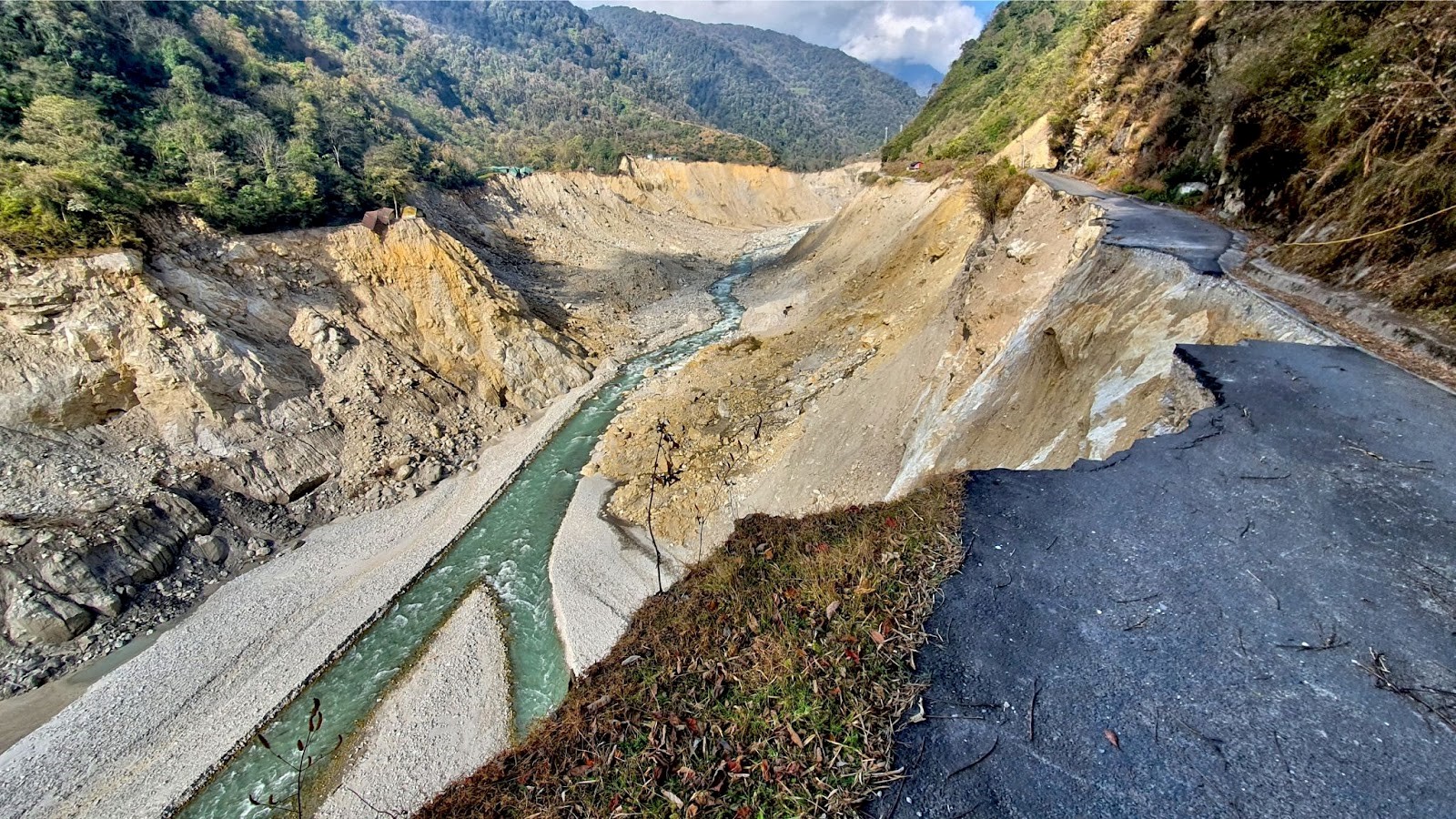 Abbildung 1: Schneise der Verwüstung entlang des Teesta-Flusses. Die Flut unterschnitt an vielen Stellen die Hänge und löste so Erdrutsche aus. Bildrechte: Praful Rao.