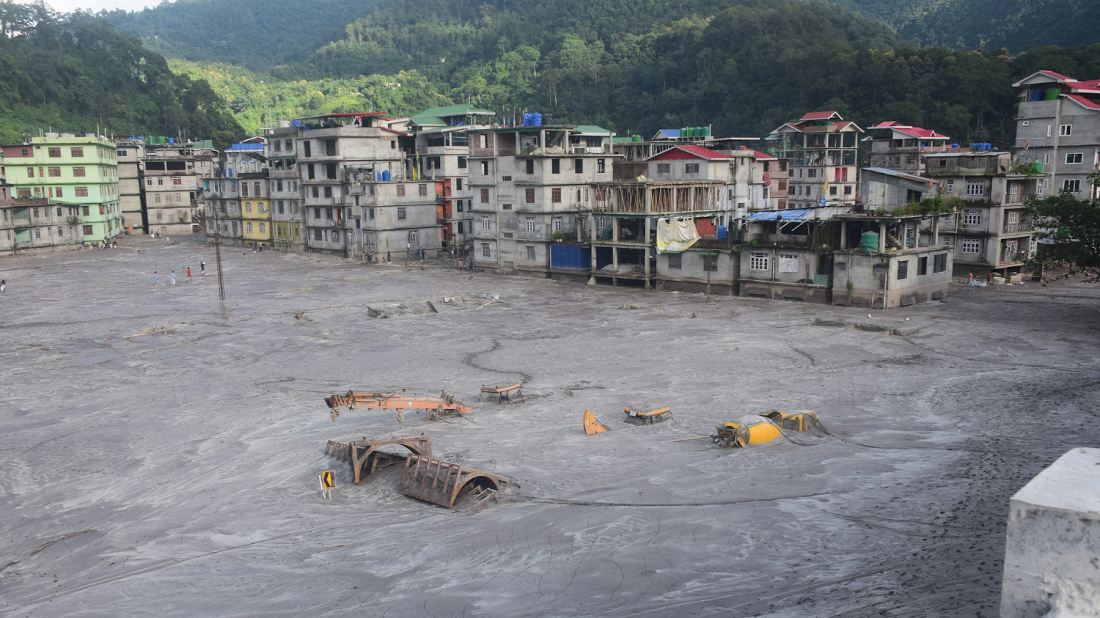 Abbildung 2: Gebäude und Autos in der Stadt Rangpo wurden unter den Sedimentmassen der Flut begraben. Bildrechte: Praful Rao.
