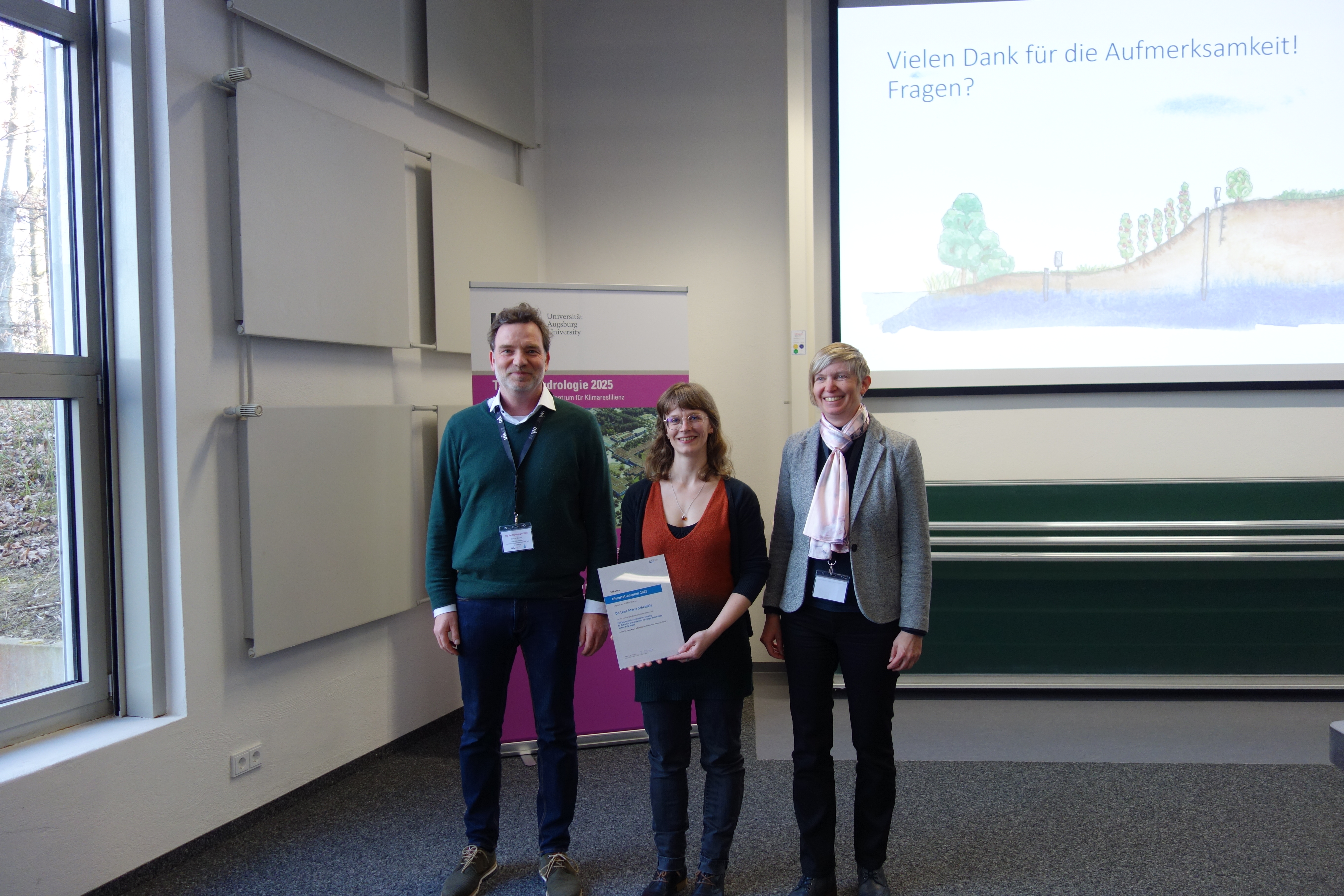 Foto: Dr. Lena Scheiffele (Mitte), ihr Doktorvater Prof. Dr. Sascha Oswald (links) und die Präsidentin der Deutschen Hydrologischen Gesellschaft Prof. Dr. Britta Schmalz (rechts) bei der Preisverleihung auf dem „Tag der Hydrologie“ am 20. März 2025 in Augsburg. Foto: Deutsche Hydrologische Gesellschaft