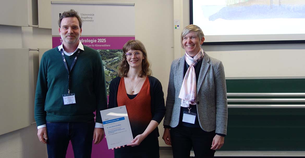 Der Preis für herausragende Dissertationen in der Hydrologie wird jährlich durch die Deutsche Hydrologische Gesellschaft vergeben und ist mit einem Preisgeld in Höhe von 1.500 Euro verbunden. Zur offiziellen Preisverleihung am 20. März 2025 auf der Konferenz „Tag der Hydrologie“ in Augsburg hat Dr. Lena Scheiffele ihre Arbeit in einem wissenschaftlichen Vortrag präsentiert.