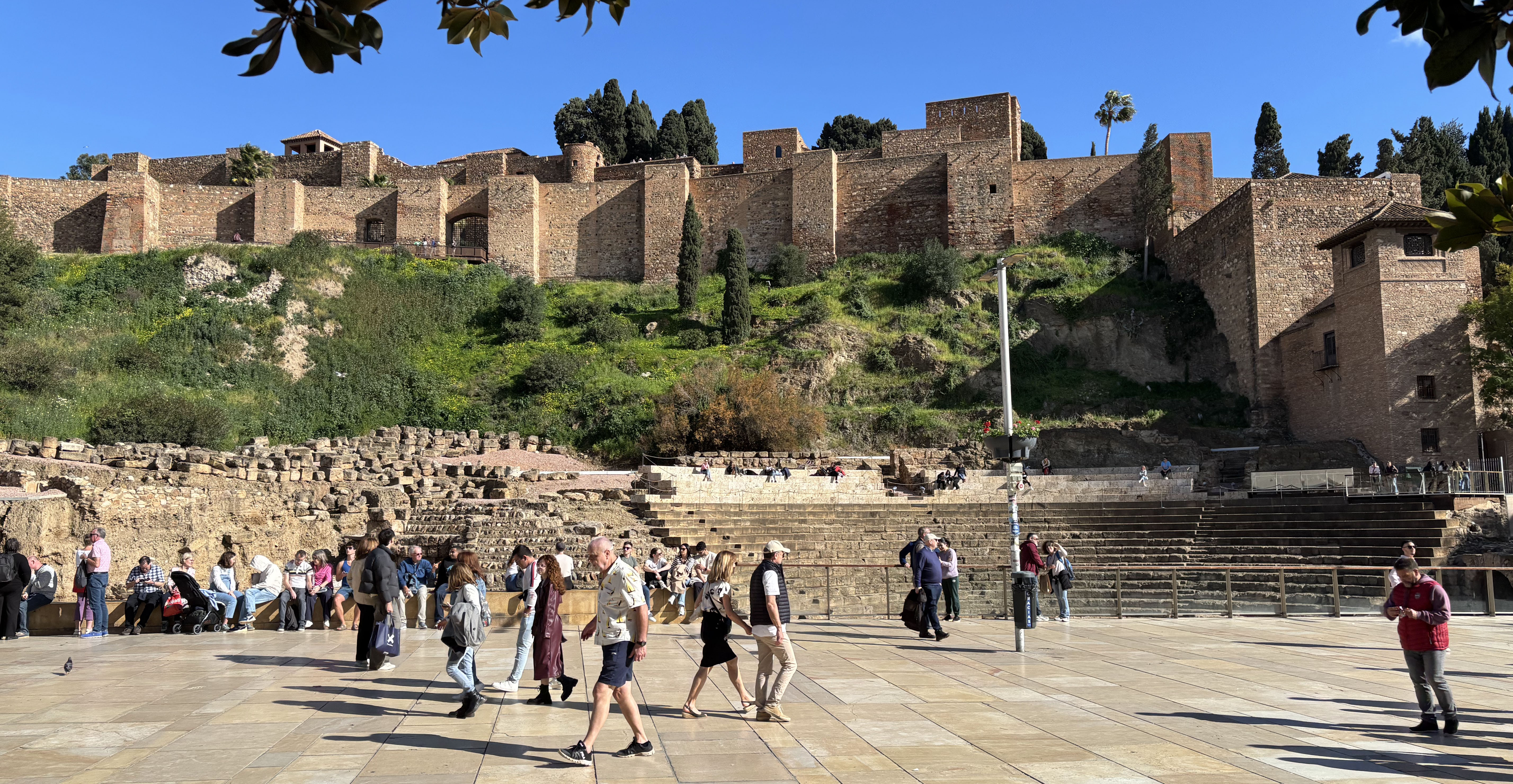 Der Rest des Tages stand uns zur freien Verfügung. Einige besichtigten die Kathedrale, andere ließen sich durch die Stadt treiben oder wollten das Meer sehen. Ich selbst schloss mich einer kleinen Gruppe an, die das Teatro romano, das römische Theater, und die Alcazaba besichtigen wollte. Der Weg hoch auf die über dem Hafen und der Altstadt thronende Burg der maurischen Herrscher war anspruchsvoll. Schwieriger noch gestaltete sich der Weg hinauf zur benachbarten Festung Castillo de Gibralfero, die wir wegen unseres Kombitickets auch noch sehen wollten. Leider hatte uns niemand gesagt, dass letzter Einlass um 17.15 Uhr war. Jegliche Verhandlung war zwecklos. Bei unserer Ankunft um 17.30 Uhr waren die resoluten Damen am Eingang durch keinerlei Charmeoffensive zu bewegen, uns noch einzulassen. Durchgeschwitzt genossen wir immerhin von oben die schöne Aussicht über die Altstadt, die Stierkampfarena und den Hafen.