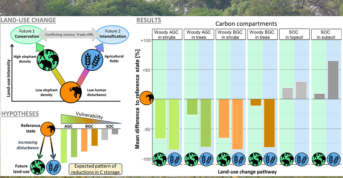 Von der Entwicklung des ländlichen Afrikas gibt es gegensätzliche Vorstellungen: Einerseits wollen Regierungen und Naturschutzorganisationen die Savannenökosysteme schützen, um den Lebensraum und die Wanderungsgebiete von Tieren wie Elefanten und Löwen zu erhalten. Andererseits basiert die Nahrungsversorgung der Lokalbevölkerung auf Ackerbau, sodass ihre Ernährung – auch infolge des Klimawandels – in Zukunft nur mit einer intensiveren landwirtschaftlichen Nutzung sichergestellt werden kann. Da Trockengebiete die größte terrestrische Kohlenstoffsenke darstellen, haben diese Zukunftsvisionen wesentliche Auswirkungen auch auf die globale Kohlenstoffspeicherung. „Das Speicherpotenzial von Savannen war jedoch bisher nicht ausreichend erforscht und ihre Kohlenstoffdynamik im Hinblick auf Störungsfaktoren wie den Verbiss durch Elefanten, Holzeinschlag und Viehzucht nur unzureichend verstanden“, sagt die leitende Autorin Dr. Liana Kindermann.