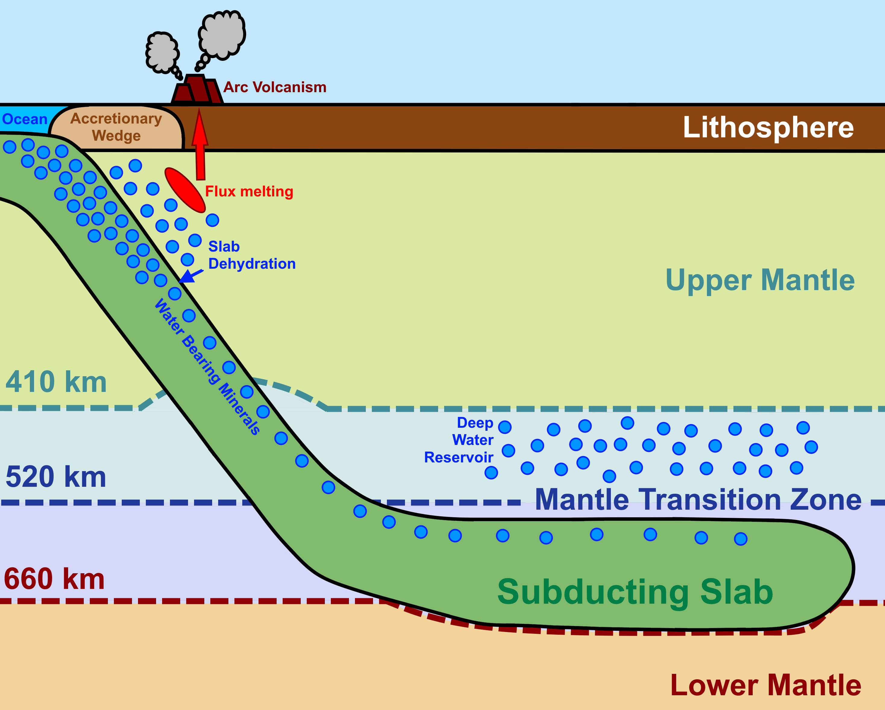 Abbildung: Zeichnung einer abtauchenden Platte und Transport wasserhaltiger Minerale zur Mantelübergangszone. Bild: Enrico Marzotto.