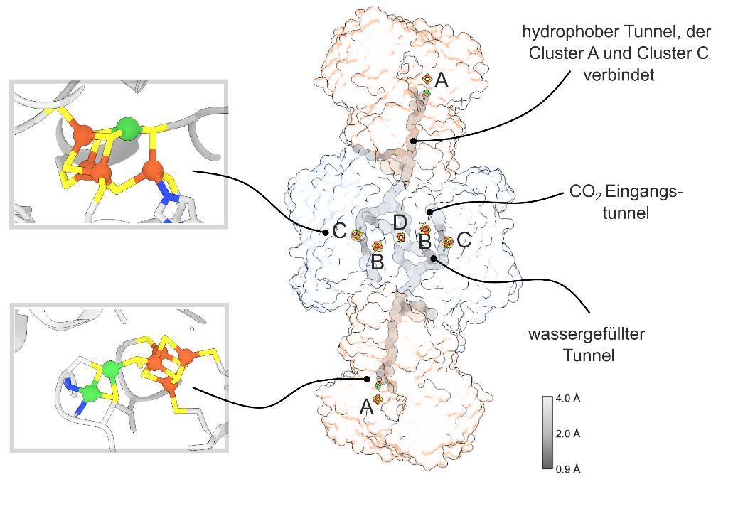 Abbildung 2: Übersicht über den CODH/ACS Komplex. Die CO2-Reduktion zu CO findet am Cluster C (C) statt. Von dort aus wandert das CO über einen hydrophoben Tunnel zum Cluster A (A). Dort findet die Kohlenstofffixierung statt. Das Zwischenprodukt CO reagiert hier mit einer Methylgruppe und Coenzym A zu Acetyl-CoA. Bild: Jakob Ruickoldt