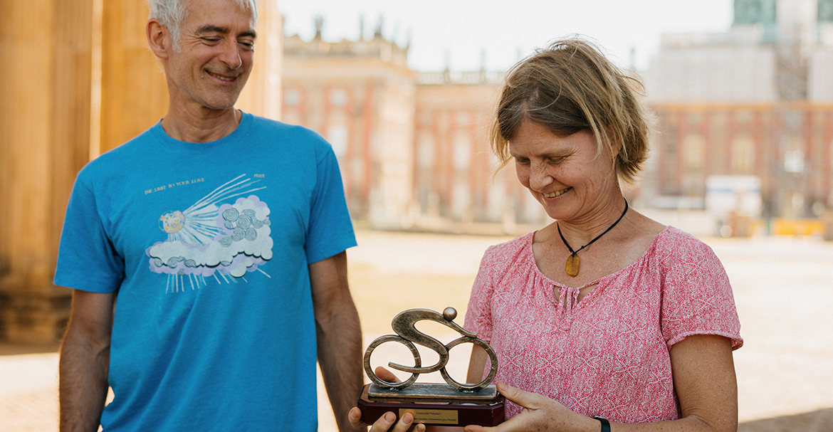 Im uni-internen Wettbewerb triumphierte das Team „PENCycle & Friends“ um Team-Kapitän Jan Pufelski. Die Abkürzung steht für „Plant Ecology Nature Conservation“ vom Institut für Biologie und Biochemie. Das Team gewann zum dritten Mal in Folge den Pokal für die meisten Kilometer pro Kopf mit beeindruckenden 757,3 km pro Teilnehmer*in und insgesamt 308 Fahrten. Damit konnten die Radlerinnen und Radler sich im Vergleich zum Vorjahr noch einmal deutlich steigern, als sie mit 489,7 km pro Kopf und über 240 Fahrten auf dem ersten Platz landeten. „Wir haben am Wochenende und nach Feierabend (es ist ja lange hell) das schöne Brandenburger und Berliner Umland erkundet“, kommentierte Tim Herkenrath vom Team den Erfolg. „Zusätzlich wurden wir von der Bahn unterstützt, die auf der Strecke zwischen Brandenburg an der Havel und Potsdam zwischenzeitlich auf Schienenersatzverkehr umgestellt hat, sodass ein Kollege für seinen Arbeitsweg lieber aufs Rad umgestiegen ist.“ Bester Kilometersammler des Teams war PD Dr. Niels Blaum, der mit insgesamt 1.310 Kilometern den dritten Platz unter allen Radler*innen der Universität Potsdam belegte. Dr. Peter Kostädt, Vizepräsident für Digitalisierung und Informationsmanagement, überreichte dem Team den begehrten Wanderpokal für das Team mit den meisten Kilometern pro Kopf, der nun ein weiteres Jahr bei den „PENCycle & Friends“ verbleibt.