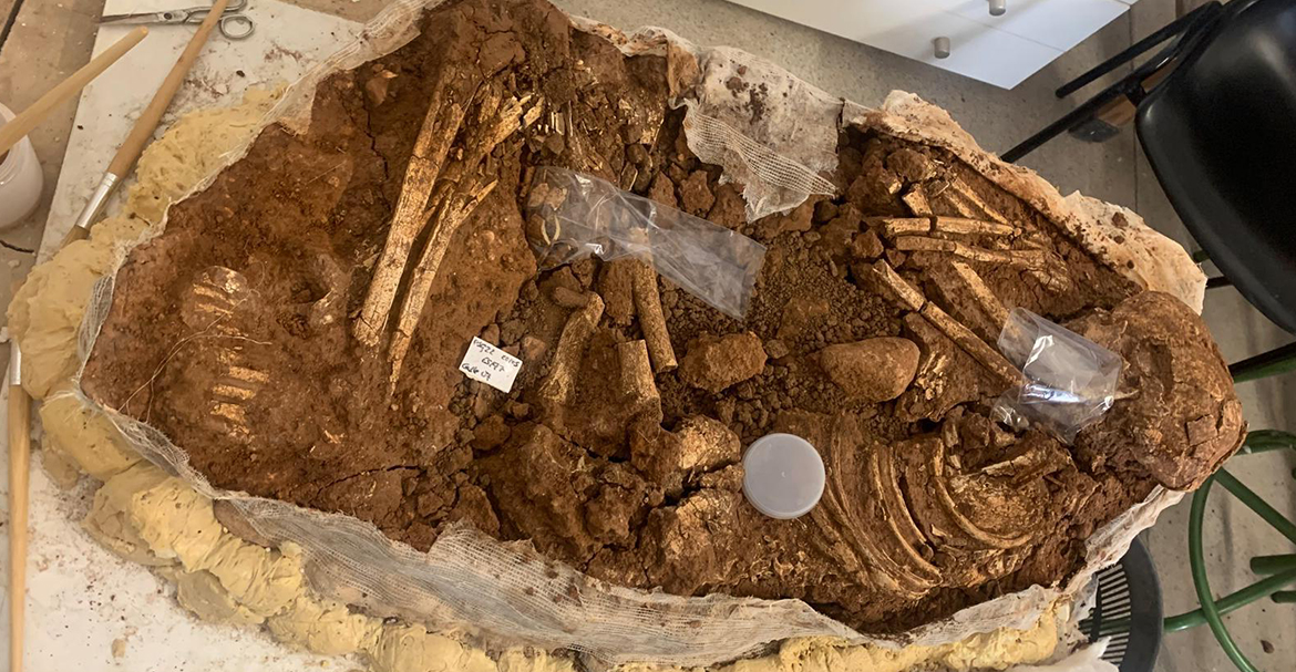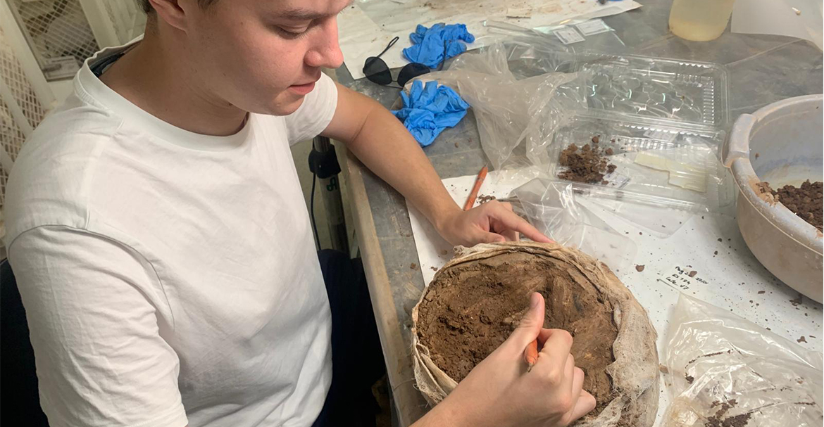 Bald kommen erste Knochenstücke oder andere Materialien zum Vorschein. So stoßen wir beispielsweise auf ein Stück geschnitzten Knochen, das womöglich zu einer Hals- oder Armkette gehört. Die Funde werden dann vorsichtig saubergepinselt und einzeln dokumentiert. Andere Studierende befreien zeitgleich die gut erhaltenen menschlichen Überreste bronzezeitlicher Skelette von ihrem Mullverband. Mitarbeitende des Museums erklären uns, dass es sich um relativ junge Menschen handelte, was sie anhand des Wuchses der Knochen des Brustkorbs erkennen können. Alles weitere muss jedoch eine anthropologische Untersuchung der Überreste zeigen.