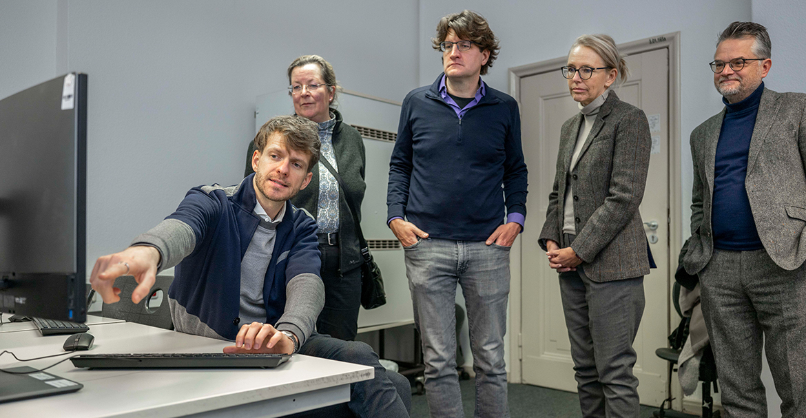 Die Organisatoren und Gäste der digitalen Probeklausur besuchen vorab den Prüfungsraum. In der Mitte (sprechend): Alexander Schulz, Leiter des ZIM der Universität Potsdam. Foto: Thomas Roese