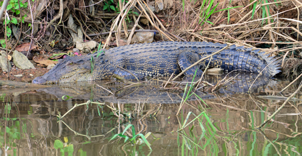 Abbildung 1: Leistenkrokodile können über sechs Meter lang und über eine Tonne schwer werden und gehören damit zu den größten und schwersten lebenden Reptilien der Welt. Sie bewohnen oft küstennahe Gebiete, wie hier zum Beispiel die Mündung des Nilgawa-Flusses in der Stadt Matara im Süden von Sri Lanka. Foto: Kathrin Glaw.