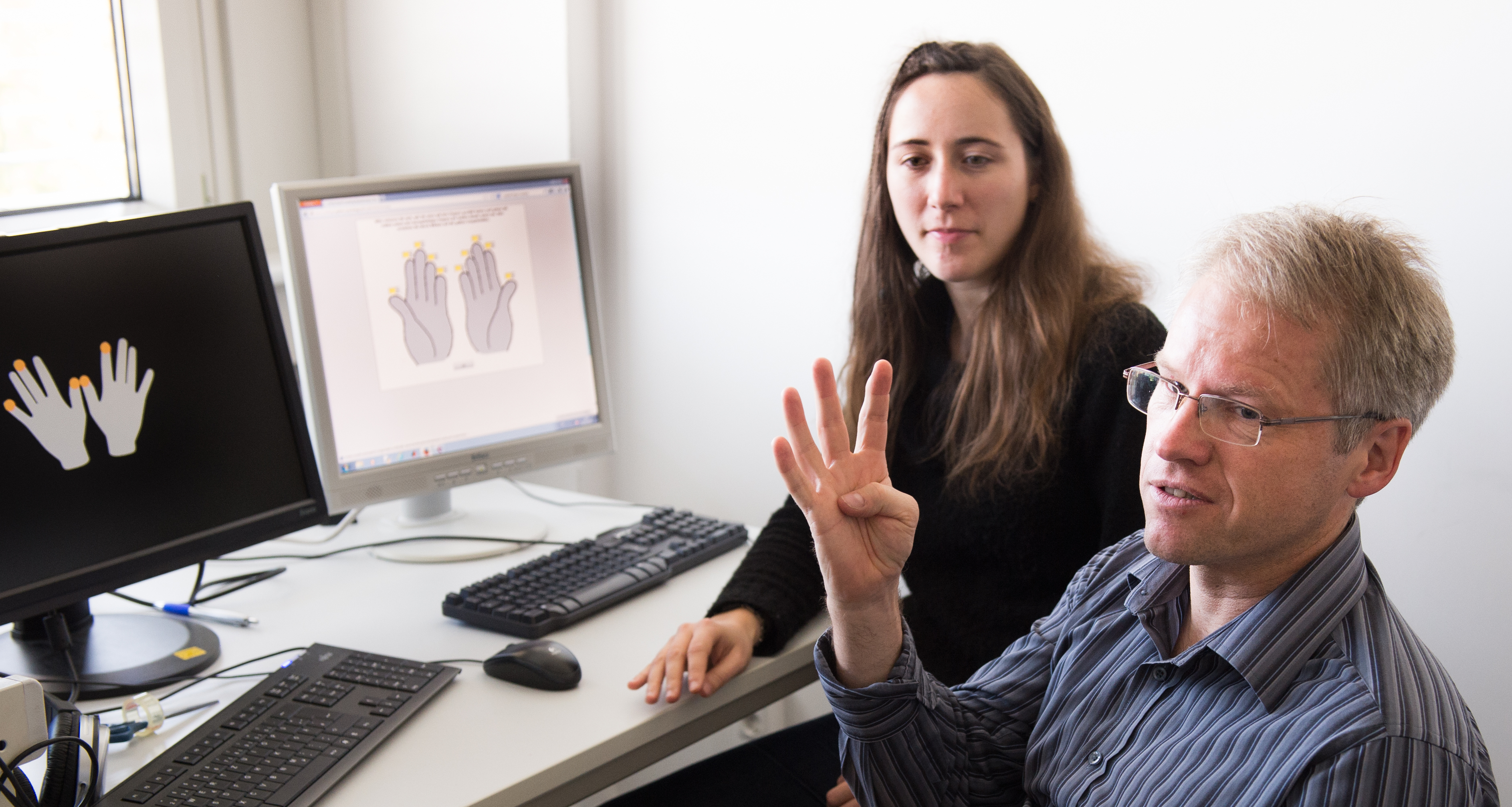 As part of the “Potsdam Embodied Cognition Group” he founded, Fischer’s current project examines the significance of finger counting for the representation of numbers in the brain. So far they have tested only adults. PhD student Elena Sixtus demonstrates a method in the laboratory for examining the relation between the fingers’ discrimination capacity and number processing, in which test subjects hold two handles that alternately stimulate their fingertips. While the subject says the number corresponding to the finger, the researcher can monitor the speed and precision of the information on a connected computer. Marks on the stimulated fingers appear on the monitor that displays two hands with the fingers spread.