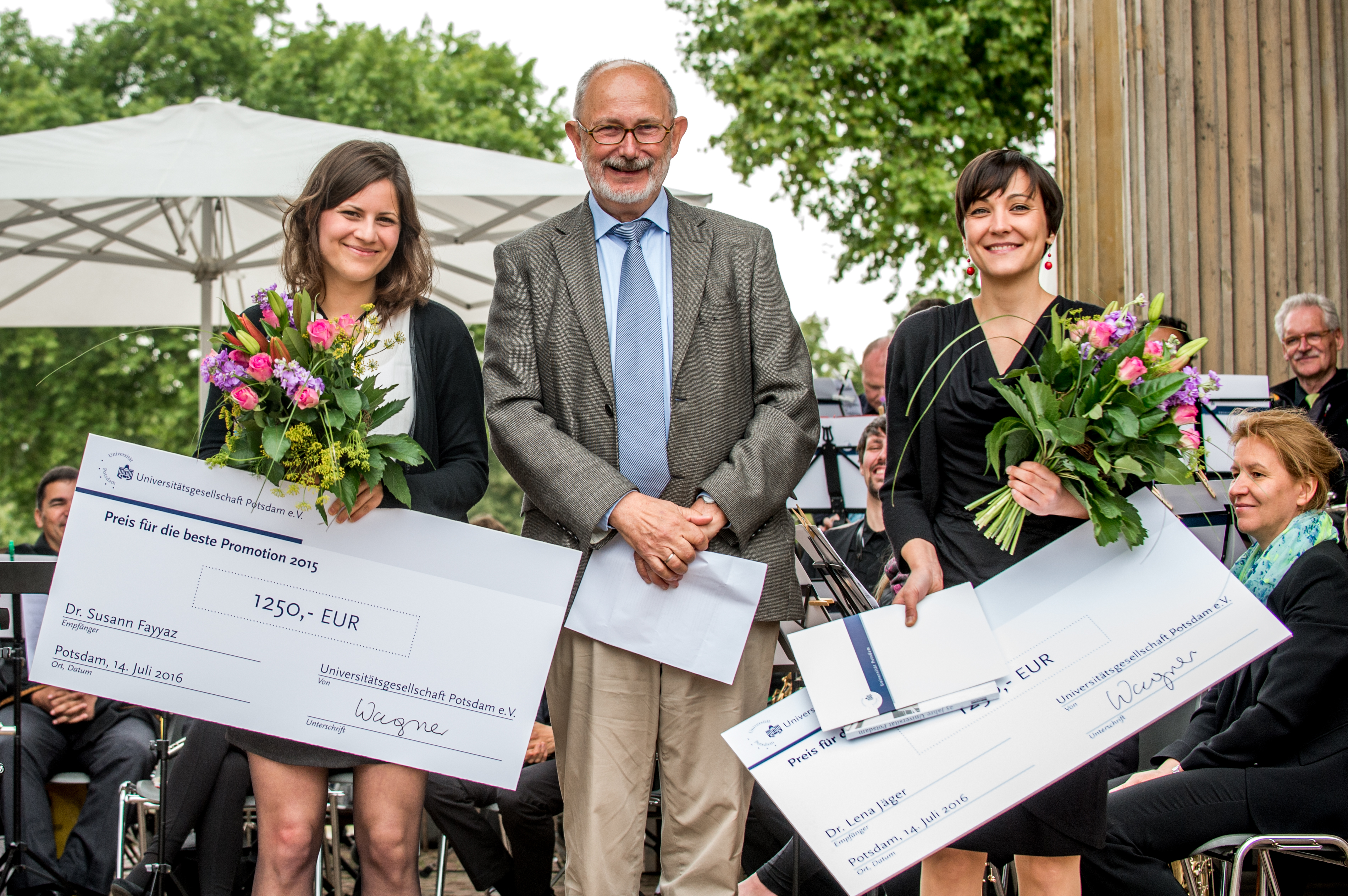 Der Preis zur Förderung des wissenschaftlichen Nachwuchses 2016 ging an Dr. Susann Fayyaz und Dr. Lena Jäger. Die Universitätsgesellschaft e.V. verleiht diesen Preis für die beste Promotion des Jahres. Sie würdigt damit die besonderen Leistungen, macht zugleich auf das bestehende Innovationspotenzial aufmerksam und schafft einen zusätzlichen Forschungsanreiz. Die Ernährungswissenschaftlerin Dr. Susann Fayyaz erhielt den Preis für ihre Dissertation zum Thema „Bedeutung bioaktiver Lipidderivate bei der Entstehung hepatischer Insulinresistenz“. Dr. Lena Jäger forscht auf dem Gebiet der experimentellen und klinischen Linguistik und beschäftigte sich in ihrer Dissertation mit dem Thema „Working Memory and Prediction in Human Sentence Parsing – Cross-linguistic evidence from anaphoric dependencies and relative clauses“.