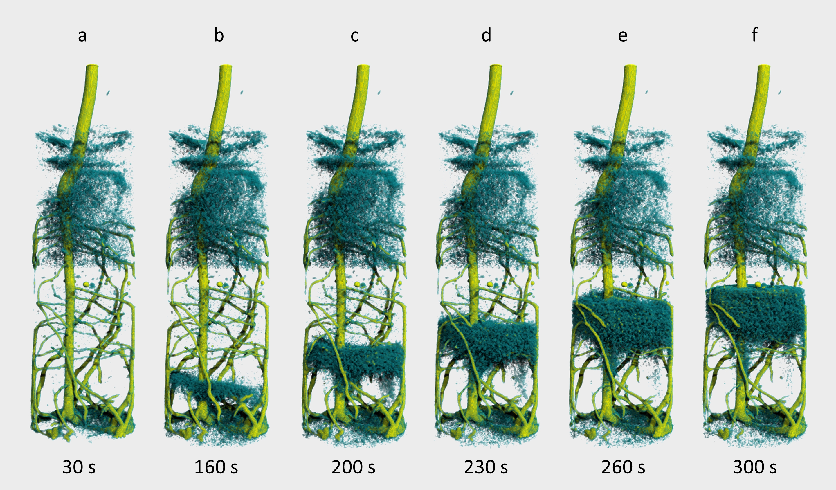 Erstmals konnten die Potsdamer Forscher in 3D beobachten, wie Wasser aus dem Boden in die Höhe steigt und von den Wurzeln aufgenommen wird. „Dies war bislang mit dieser Zeitauflösung nur in Durchsicht durch die Probe, also in 2D, möglich“, erklärt Dr. Christian Tötzke, Erstautor der Studie, die nun in „Scientific Reports“ erschienen ist. Die Ergebnisse erweitern das Verständnis von Wechselwirkungen zwischen Wurzeln und Böden, was sich bis hin zur Zucht und zum Anbau solcher Nutzpflanzen auswirken könnte. Die neue Aufnahmetechnik, die gut 100mal schneller ist als bisherige Verfahren, könnte es auch in anderen Proben ermöglichen, schnelle Prozesse in Echtzeit zu beobachten, etwa in Brennstoffzellen, Batterien oder Baustoffen.