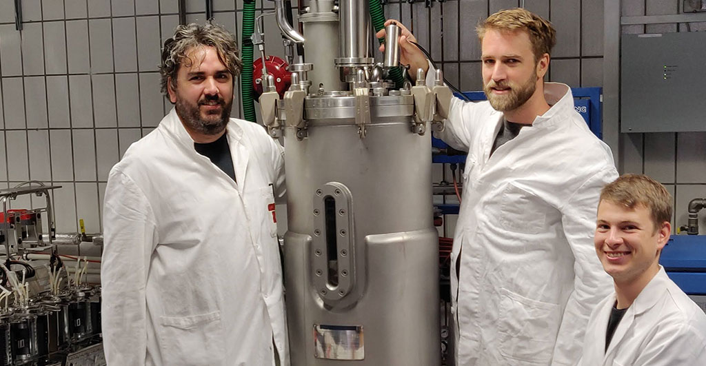Thomas Schiewe (middle) with his colleagues of the bioprocess engineering team of TU Berlin who develop and research the bioplastic process