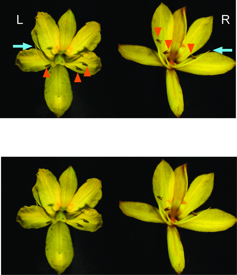 Photo: Left- and right-styled flowers of Wachendorfia paniculata. The blue arrows indicate the styles, the orange arrowheads the anthers. Two of the three anthers are bent to the other side than the style. Credit: Michael Lenhard