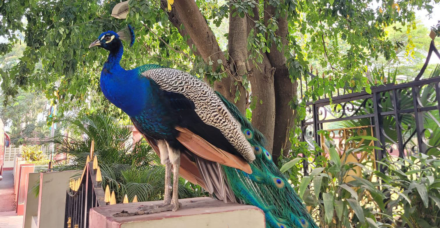 We then drive to the Ashanti Culture Center to learn more about Ghanaian culture. All the inhabitants of the Ashanti region are called Asante and belong to one of the seven different tribes. We can see the importance of family even in the typical construction of buildings, which are all built around a large common courtyard. The royal family always comes from the tribe of the eagle. In contrast to European royal families, succession to the throne is determined by the maternal bloodline. If the king dies, the king's mother may appoint another family member as king. Drums are used to communicate with the population as well as to scare off wild animals, which can be heard even over long distances. To top it all off, we drive to the royal palace. Due to strict security measures, we can only catch a brief glimpse of the new palace from a distance. Instead, we take part in a guided tour of the former palace, which is right next door. In front of the building, which is very simple for a royal palace, stands an imposing tree with several peacocks resting in its shade. The peaceful atmosphere almost makes us forget the piles of garbage and sparse human dwellings just outside the grounds.