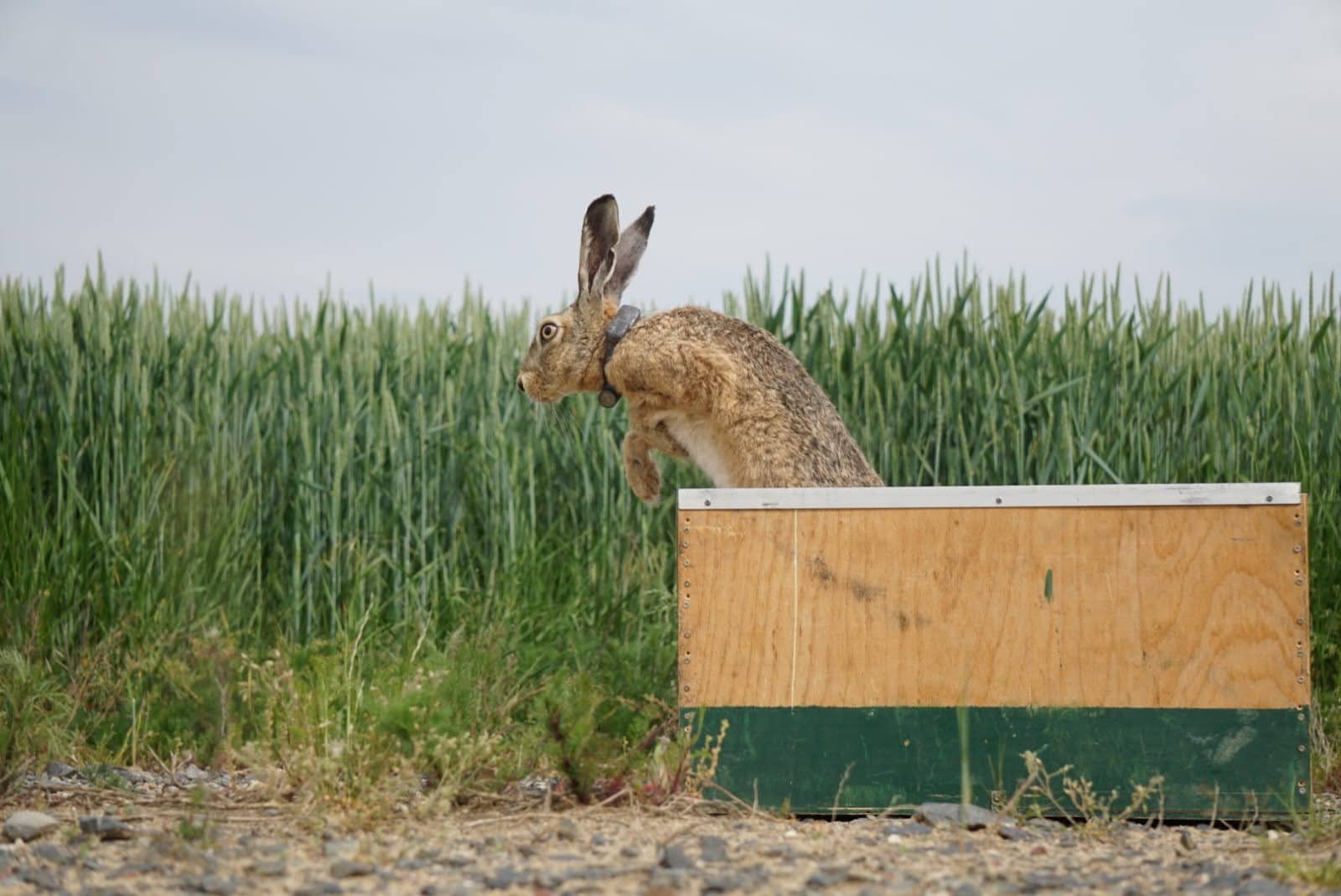 2024_089_hare_release_Carolin_Scholz: A hare fitted with a tracking collar jumps out of a transport box. Photo: Carolin Scholz.